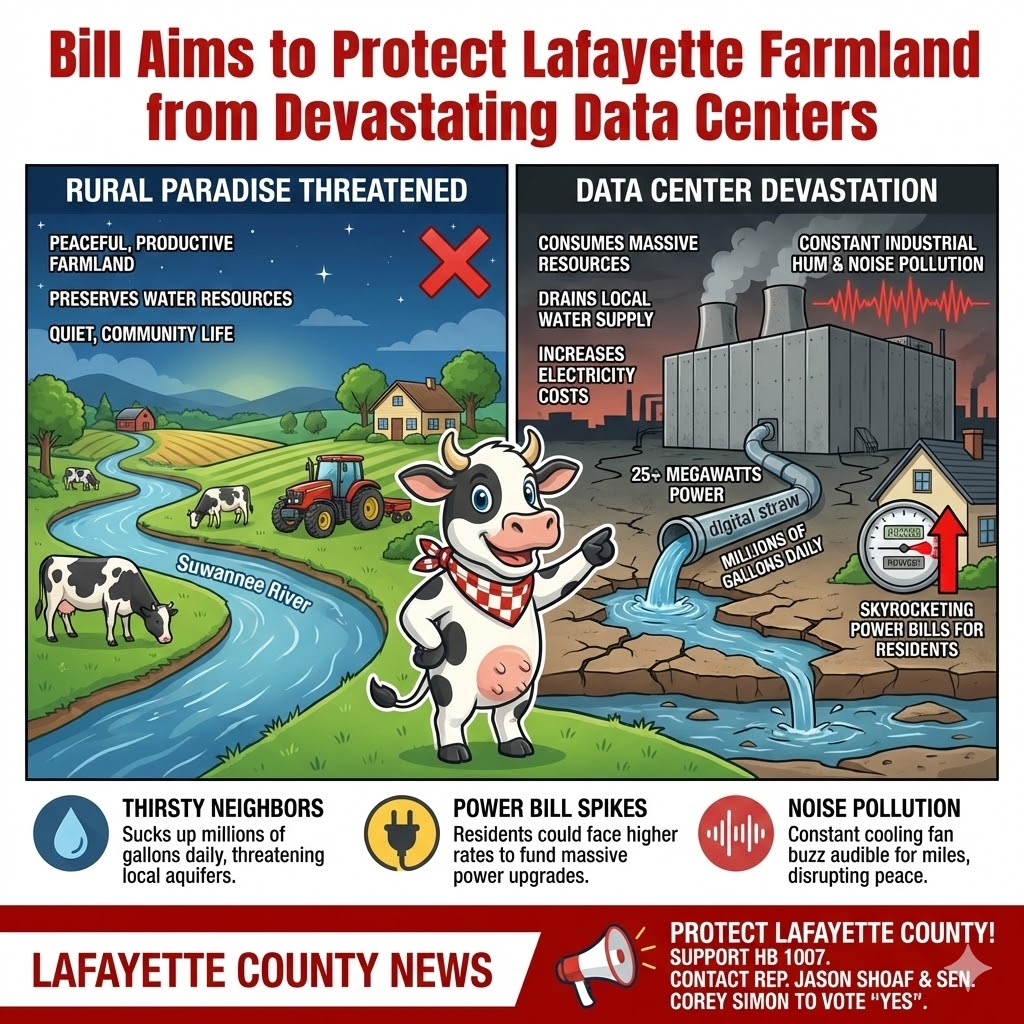 MAYO, FL - Imagine waking up not to the sound of a rooster or the wind in the pines, but to a constant, industrial hum that never stops, day or night. Picture our beautiful Suwannee River basin being sucked dry by a "digital straw" as millions of gallons of water vanish every day just to keep a city-sized block of computers cool.