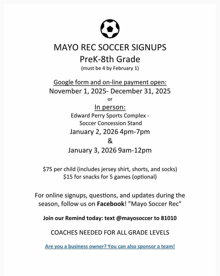 - Where to sign up: Visit the Mayo Rec Soccer Facebook Page or email