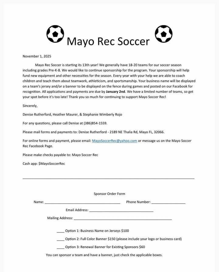 Sponsorship Deadline: All applications and payments are due by January 2, 2026. Forms can be mailed to Denise Rutherford at 2189 NE Thalia Rd, Mayo, FL 32066.