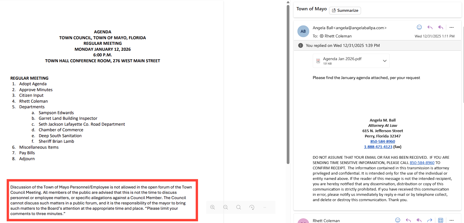 Instead of a helpful reply from the Clerk, he received a surprising email from Town Attorney Angela Ball. The attorney sent over the upcoming agenda with Coleman’s name already listed to speak, but the document had a massive new disclaimer at the bottom that had never been there before.