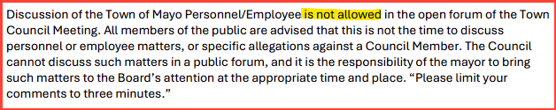 According to the meeting agenda sent to Coleman, this new rule warns that any discussion about town employees is "not allowed" and that a public forum is not the time to bring up "specific allegations against a Council Member".