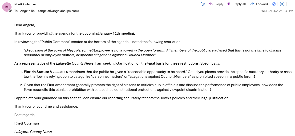 MAYO, FL - The Town of Mayo is facing a massive legal question after releasing a new "gag order" on its January 12 meeting agenda. The new rules, which appeared right before a local reporter was set to speak, claim that citizens can no longer complain about town employees or make "allegations" against council members during public meetings. Many legal experts believe this move is a direct hit against the First Amendment and Florida’s famous Sunshine Laws.