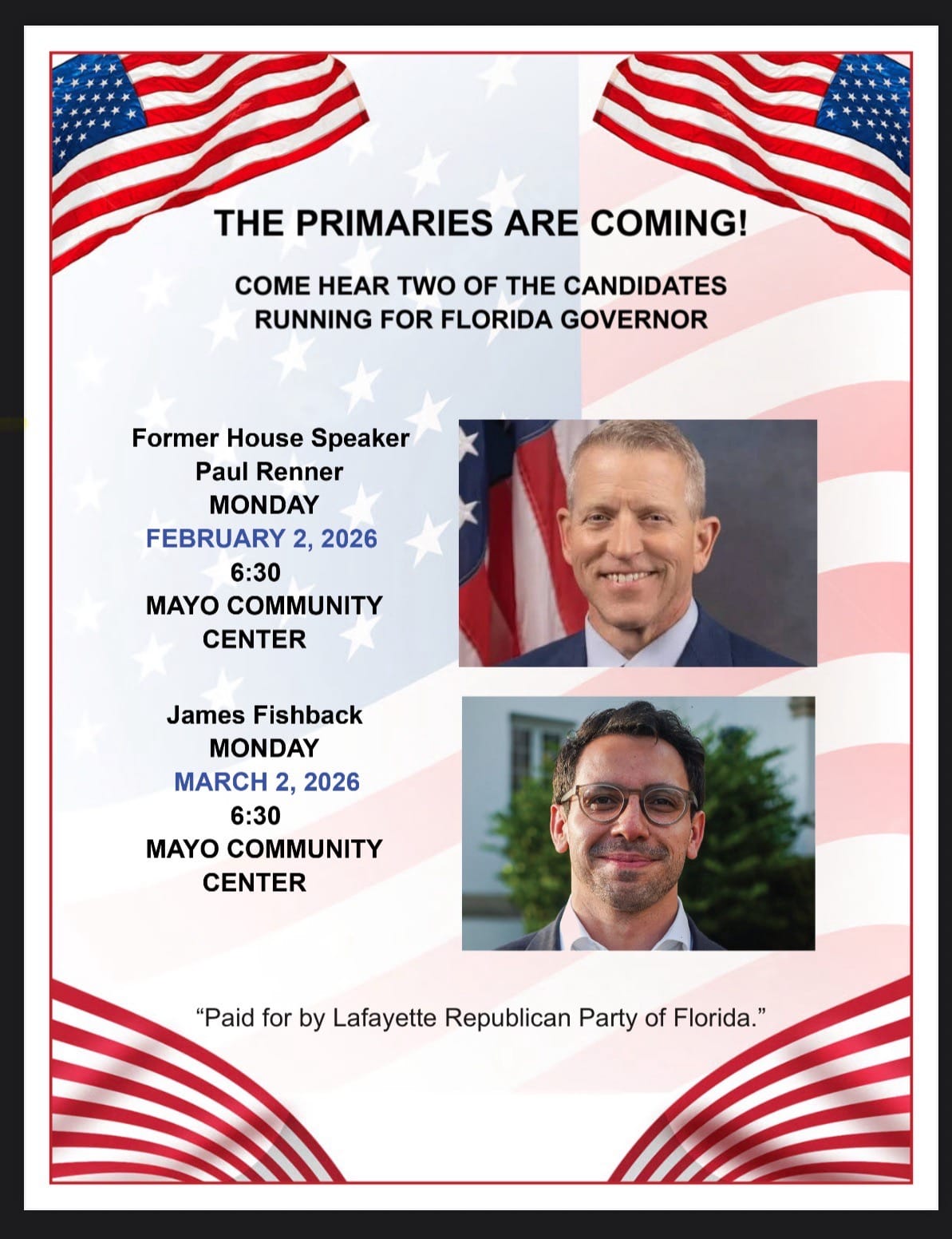 MAYO, FL - The political spotlight is shifting toward Lafayette County as the 2026 gubernatorial race heats up, bringing high-profile candidates directly to the heart of Mayo. The Lafayette Republican Party of Florida has officially announced a duo of upcoming "Meet the Candidate" events at the Mayo Community Center, offering local voters a front-row seat to the battle for Florida’s future. Former House Speaker Paul Renner and investor James Fishback are slated to take the stage in back-to-back months, each looking to secure the support of North Florida’s conservative base ahead of the August 18 primary.