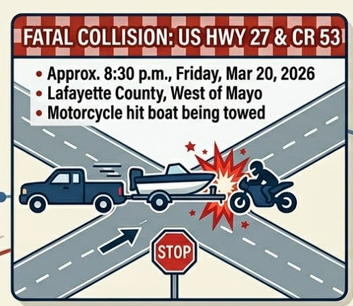 MAYO, FL - The quiet rhythm of a Friday night in Lafayette County was shattered by a devastating collision that has left the local community and neighboring Lake City in mourning. At approximately 8:30 p.m. on March 20, 2026, a tragic double fatal motorcycle accident occurred at the busy intersection of U.S. Highway 27 and County Road 53, just a few miles west of the Mayo town limits. The crash, which involved a motorcycle and a pickup truck towing a boat, resulted in the immediate loss of two lives and serves as a somber reminder of the vulnerabilities faced by riders on Florida’s rural corridors.